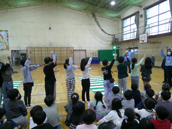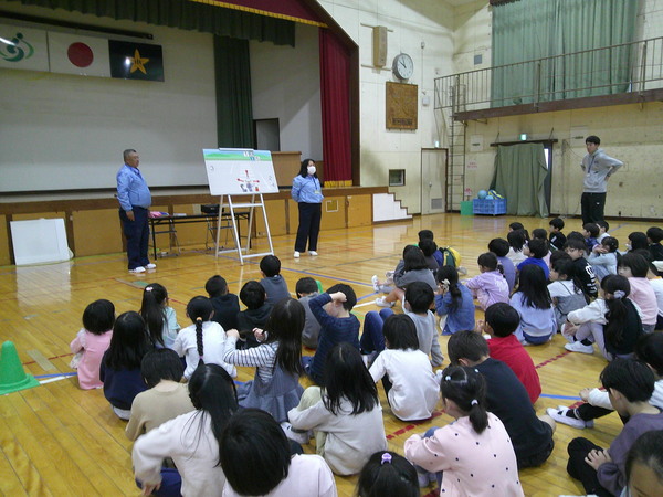 最後に、右手を高く挙げ、左手で「信号よし、右よし、左よし、右よし、信号よし!」で横断歩道を渡るという練習をしました。あいにくの雨で、体育館での実施となりましたが、子どもたちは真剣に取り組むことができました。